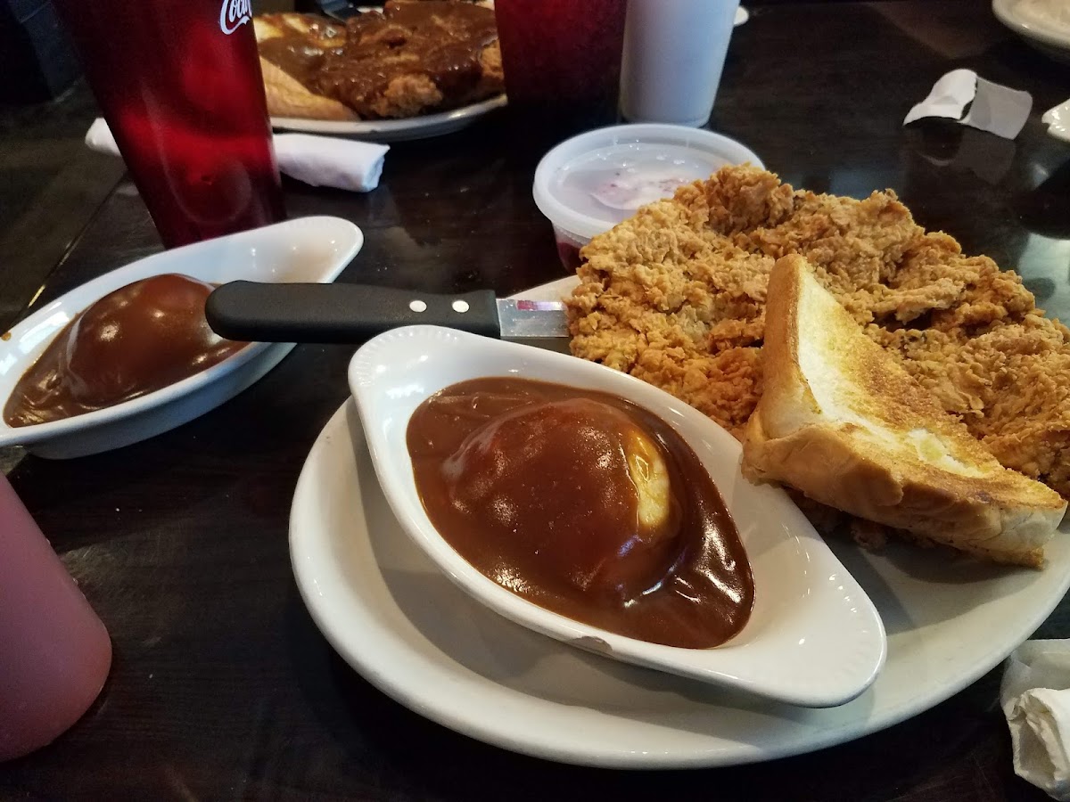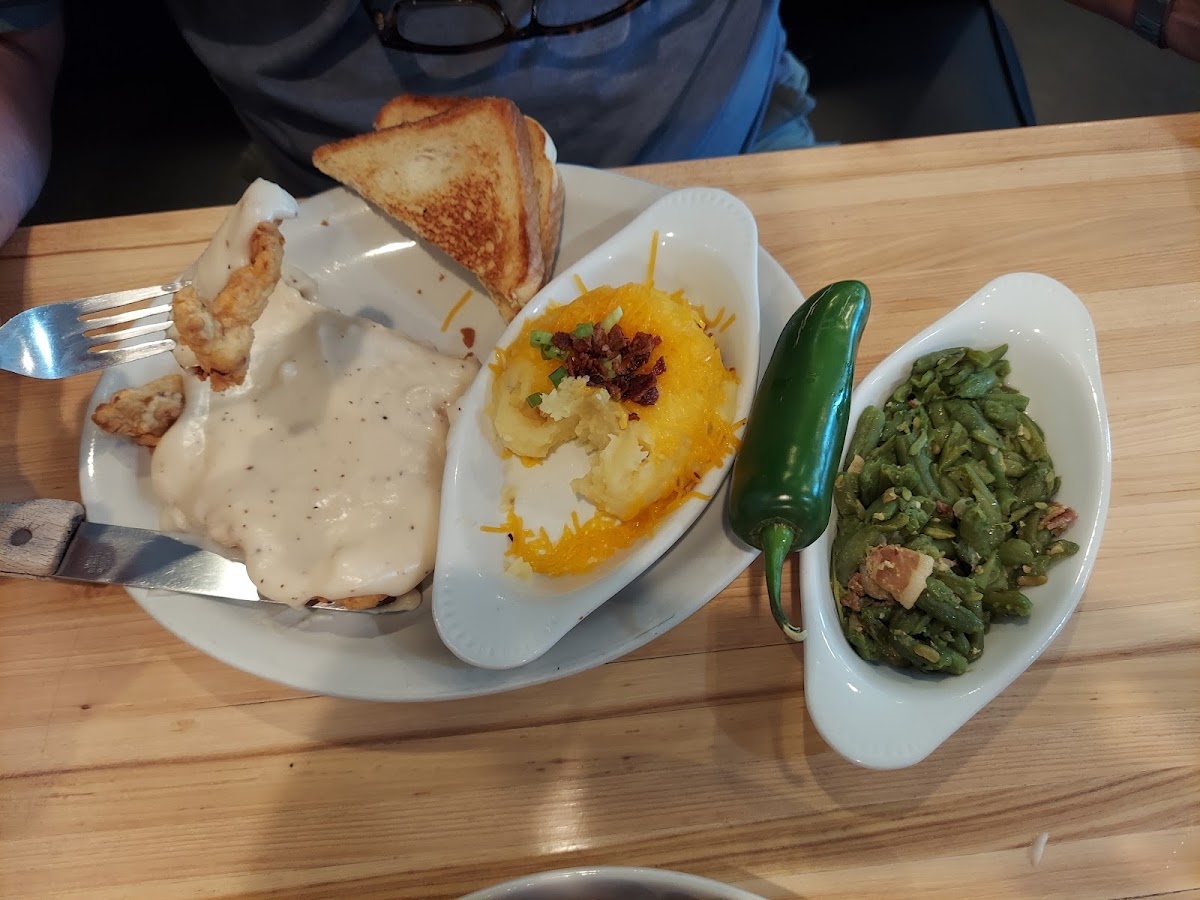 The menu leans heavily on Southern favorites done well, with standout dishes including chicken fried steak and chicken fried chicken served up with classic sides like mashed potatoes, green beans, and fried okra. Fried shrimp baskets, hamburgers with interesting twists such as jalapeño bread, and loaded mashed potatoes show the kitchen’s comfort-food chops. The selection also includes kid-friendly options, making it a good choice for families looking for familiar, crowd-pleasing meals.